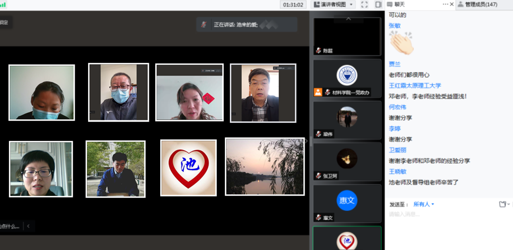 张忠璞书记首先对老师们在家不离岗、全身心投入教学的工作态度表示衷心感谢,对两位教师的精彩分享给予了肯定和表扬,希望全院教师继续凝心聚力、共克时艰,不断总结经验,取长补短,加强交流,打好这场疫情防控阻击战,保障学院教学、科研各项工作平稳有序进行。