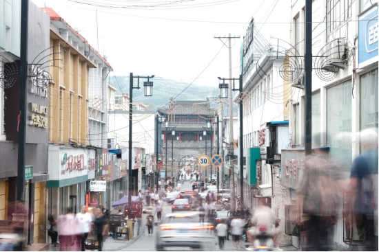 (主街前面络绎的人流和远处的城楼)