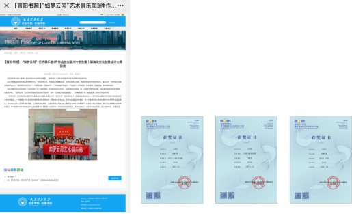 3、2021年全国大中学生第十届海洋文化创意设计大赛“如梦云冈”艺术俱乐部组织参加初审作品9件,其中《记海错沙鱼国画插图》、《经略海洋》和《海错图谱》获得大学组佳作奖;2021年俱乐部成员组队参加三创赛,获校赛二等奖;2022年在taptap点点官方网站大学百廿校庆之际,俱乐部成员分两个不同方向创作团队,在两个月时间里,深挖校园文化,创作14余件作品,并开发明信片等相关衍生品。2022年山西平面设计奖,俱乐部入围20余件作品,2件获优秀奖……