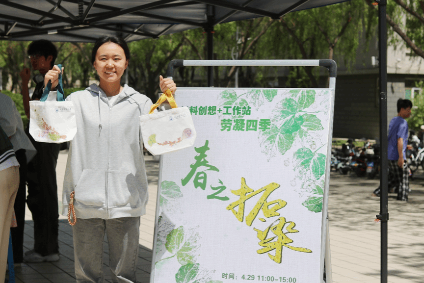 现场活动氛围热烈,参加活动的师生们选择了适合拓染的植物,经清洗、构图、敲拓等工序,将自然之美定格于帆布包。曾参与图书馆志愿服务的武奇宇同学感叹:“上千次敲击才能让色素均匀渗透,这比数据录入更需要专注力。”曾多次参与校园实践勤工助学岗位的杨晓婷同学表示“原来劳动不仅是体力付出,更是创造美的过程。”学院资助负责人李敏宜老师在活动现场表示:“要让同学们在劳动中既锤炼‘造物’的技艺,也培养‘造美’的素养。”